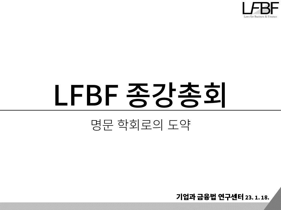 일시 : 23. 2. 16. (목) 오후 6시 장소 : 법무법인(유한) 바른 12층 대회의실 참여기관 : 성균관대학교 법학전문대학원 기업과 금융법 센터 <주제> 1. 부동산 신탁 현안 및 주요 쟁점 2. 조각투자 현안 및 규제동향 총 16인의 LFBF 학회원이 제1회 바른 상속신탁아카데미를 수료하였습니다. 아카데미 수료 후 법무법인...