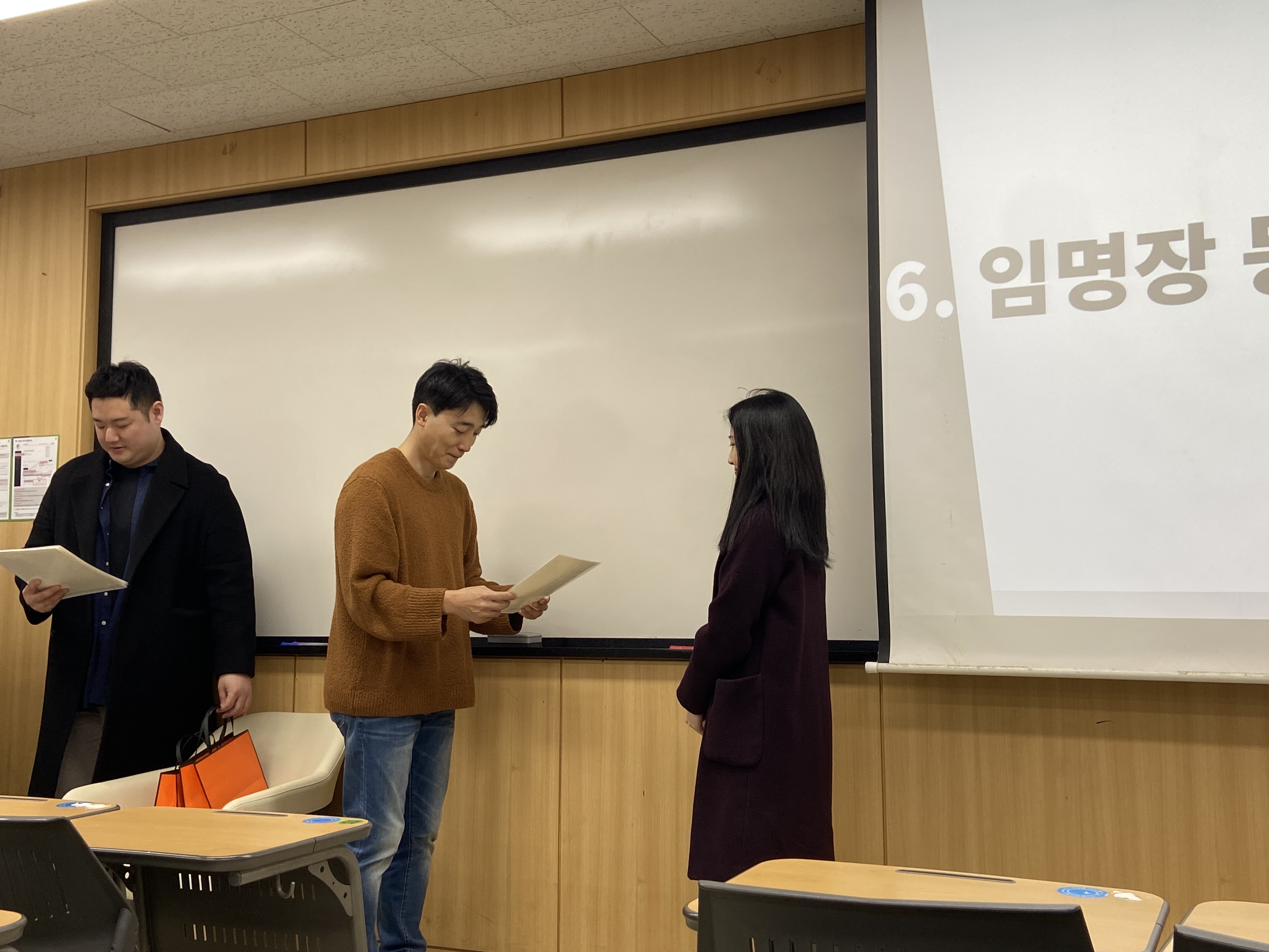2023.03.01. 2023년 1학기 개강총회를 진행하였습니다. 1. 개회사 2. 조직체계도 3. 성과보고(동계방학 프로젝트 케이스라운드) 4. 홈페이지 리뉴얼 공지 5. 향후 운영 방향 6. 임명장 등 수여 7. 공지사항 공유 위의 식순으로 진행되었으며, 동계방학 프로젝트 수행에 관한 소감을 나누며 한층 견문을 넓히고 지난 학기 동안...