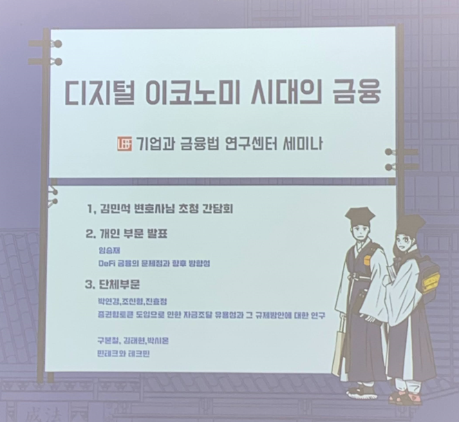 ‘디지털 이코노미 시대의 금융’을 주제로 제1회 학술세미나를 진행하였습니다. - 1팀: 증권형토큰 도입으로 인한 자금조달 유용성과 그 규제방안에 대한 연구 (박연경, 조신형, 진효정) - 2팀: 핀테크와 테크핀 (구본철, 김태현, 박시온) - 개인발표: DeFi 금융의 문제점과 향후 방향성(임승재)